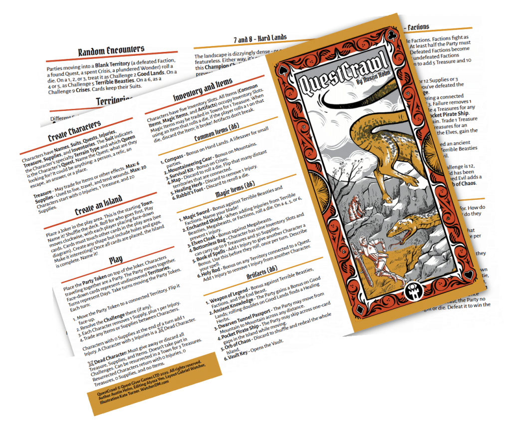 Head on over to Itch.io or DriveThruRPG to pick up a copy. There are community copies while they last. Don’t forget to post pictures of your islands on socials with #QuestCrawl. Version 1.3 includes revisions and improvements to readability and playability, a black and white print-friendly copy of the game, and a character sheet and…